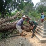 Babinsa bersama warga sekitar bergerak cepat untuk melakukan pembersihan, menggunakan peralatan manual guna memotong dan menyingkirkan batang pohon yang melintang di jalan. Upaya ini dilakukan untuk memastikan akses masyarakat kembali normal.