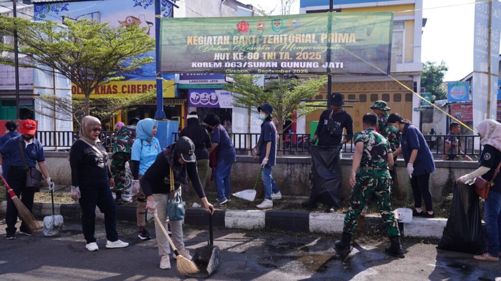 Kota Cirebon – Dalam rangka memperingati Hari Ulang Tahun (HUT) ke-80 Tentara Nasional Indonesia (TNI) tahun 2025, Korem 063/SGJ bersama Kodim 0614/Kota Cirebon melaksanakan kegiatan Bakti Teritorial Prima berupa pembersihan Pasar Pagi yang berlokasi di Kelurahan Kejaksan, Kecamatan Kejaksan, Kota Cirebon, Jumat (12/9/2025).