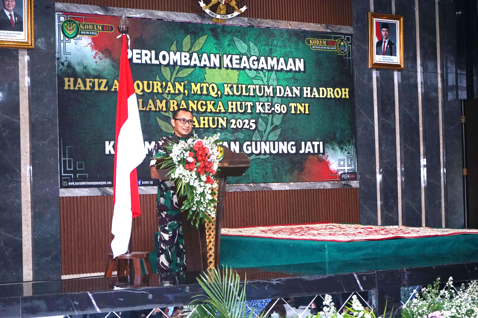 Kota Cirebon – Komandan Korem 063/Sunan Gunung Jati (SGJ) Kolonel Inf Hista Soleh Harahap, S.I.P., M.I.P., M.Han., membuka secara resmi perlombaan keagamaan dalam rangka memperingati Hari Ulang Tahun (HUT) ke-80 Tentara Nasional Indonesia (TNI) bertempat di Aula Makorem 063/SGJ, Jumat (26/9/2025).